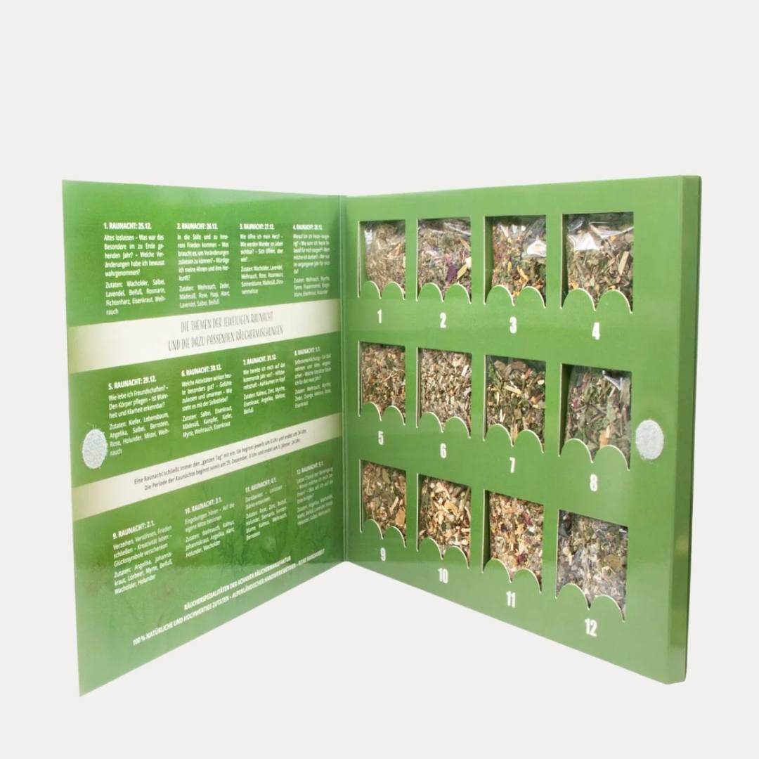 Raunachtkalender gefüllt mit 12 Räucherwerken à ca. 2g